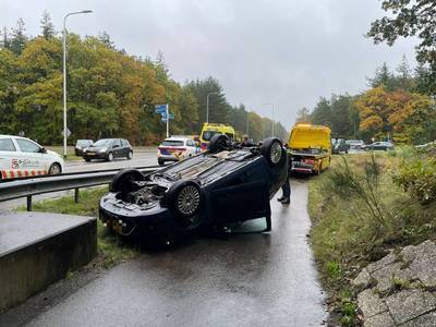 Auto slaat over de kop en belandt naast vangrail bij botsing in Nunspeet