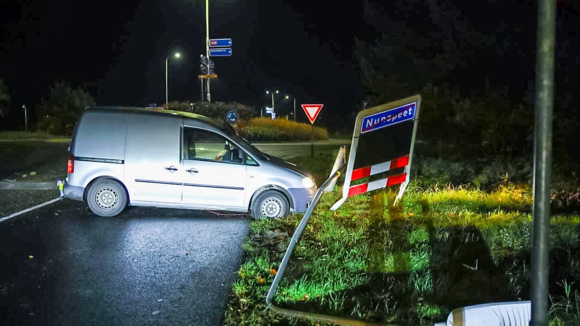 De bestuurder van een bestelbusje is in de nacht van zaterdag op zondag tegen een lantaarnpaal en een plaatsnaambord in Nunspeet gereden. Zijn voertuig raakte daarbij zwaar beschadigd.