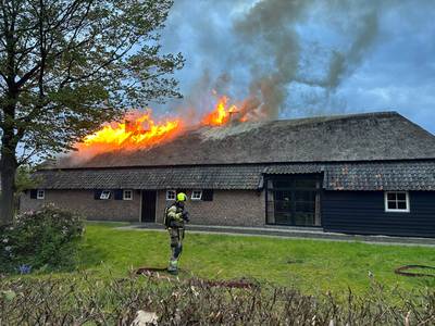 Grote brand verwoest huis met rieten kap, vlammen slaan metershoog uit dak