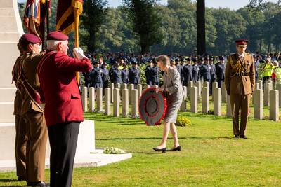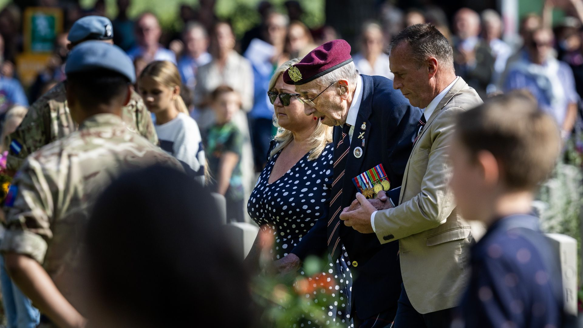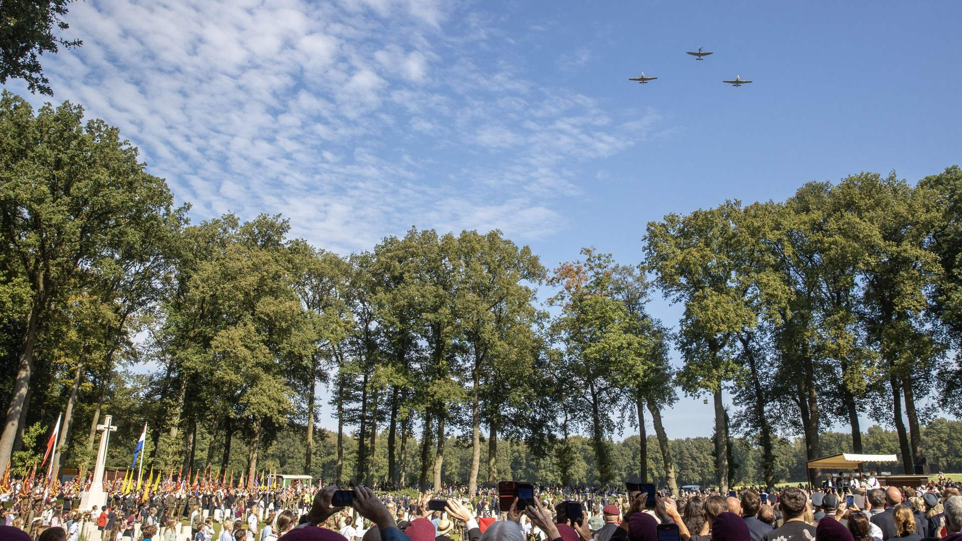 Op het Britse ereveld in Oosterbeek worden zondag de geallieerde militairen herdacht die tachtig jaar geleden sneuvelden tijdens Operatie Market Garden en de Slag om Arnhem die daarvan onderdeel was. Een half uur voor de herdenking is het al zo druk dat er niemand meer bij kan. De organisatie verwacht dat er ruim 10.000 bezoekers afkomen op deze Airborne Memorial Service, omdat het om een jubileumjaar gaat.