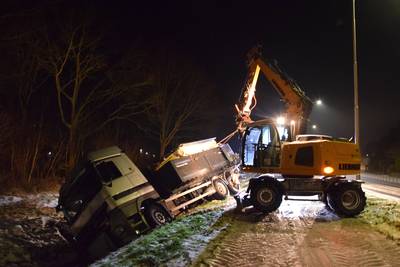 Strooiwagen belandt in sloot door gladheid