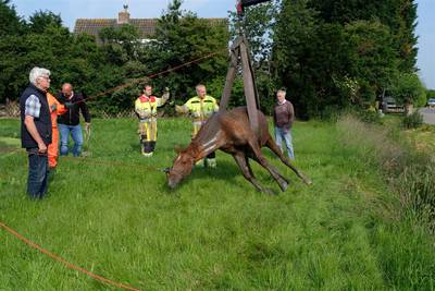 Er staat een (drachtig) paard in de sloot; en de brandweer takelt haar eruit