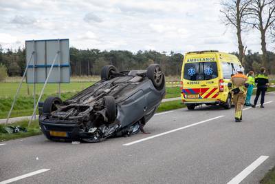 Auto botst hard tegen boom, eindigt op z'n kop op de weg