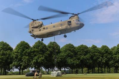 Een testvlucht van een Chinook kreeg dinsdag een onverwachte wending. Boven Ossendrecht verloor de helikopter een deur. Die viel vervolgens in een weiland.