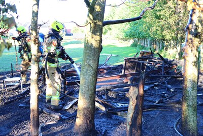 Bomen en pipowagen in brand