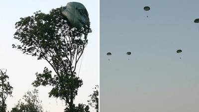 Airbornesprong gaat helemaal mis: parachutisten belanden in boom en raken gewond