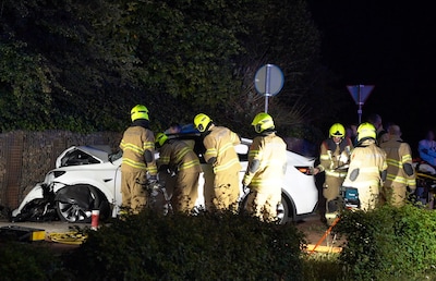 Tesla botst tegen muur in Putten, bestuurder raakt gewond en moet bevrijd worden
