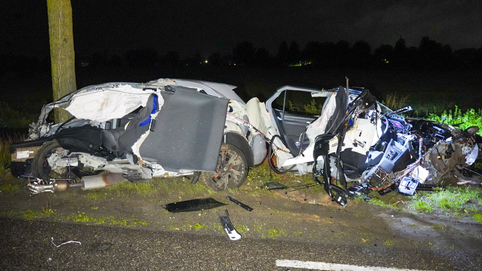 Een enorme ravage in Raalte vannacht. Een auto is doormidden gespleten bij een botsing met een boom. De bestuurder raakte gewond en moest naar het ziekenhuis.