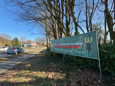 Spandoeken van omwonenden tegen komst van de McDonald’s hangen er net, maar zijn nu al beklad