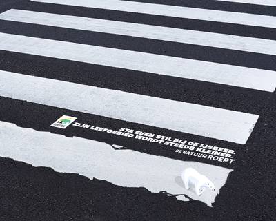 zaterdag 18 juni 2022, 13:23 uurIn Utrecht, Den Bosch, Wageningen, Veenendaal en Rhenen is op een aantal zebrapaden een schildering aangebracht van een ijsbeer. Er staat bij: ‘Sta even stil bij de ijsbeer. Zijn leefgebied wordt steeds kleiner. De natuur roept’.