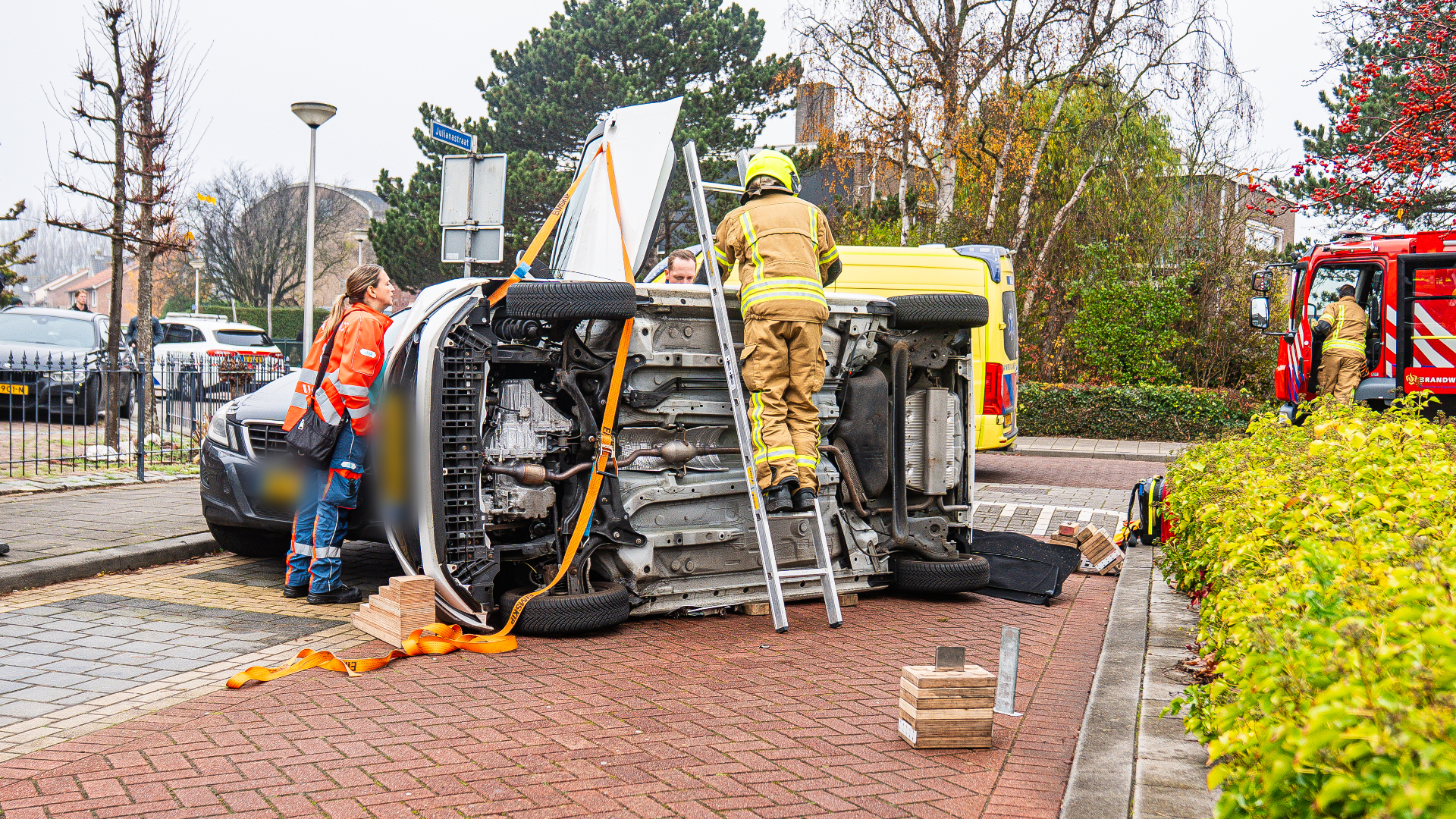 Auto kantelt in woonwijk, bestuurder door brandweer bevrijd