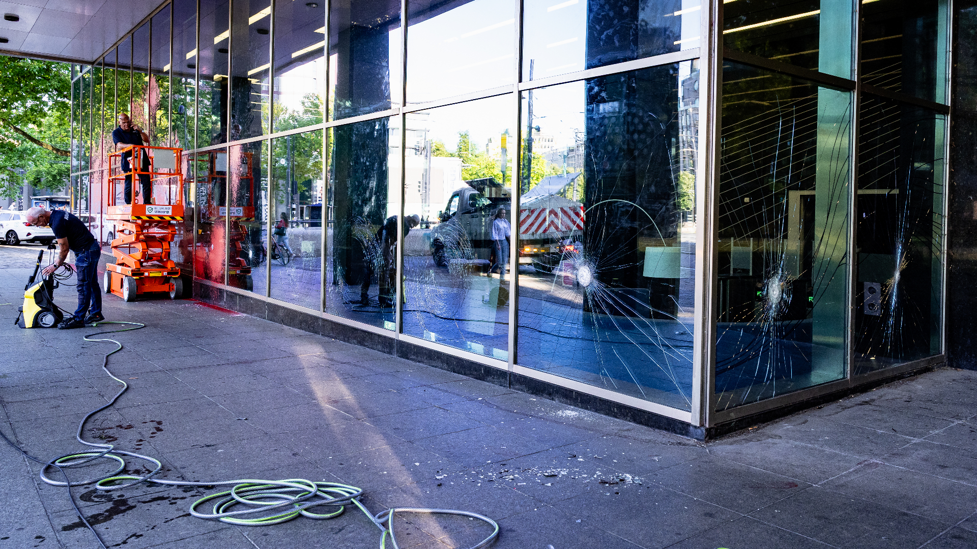 Kantoor van verzekeringsmaatschappij Allianz op Coolsingel beklad, ruiten ingeslagen