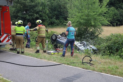 SCHAIJK - Aan de Rijksweg in Schaijk is zaterdagmiddag rond 14.00 uur een auto op de kop langs de weg beland. Er ontstond een kleine brand terwijl de vrouw nog in de auto zat. Een traumahelikopter kwam naar de plek van het ongeluk.