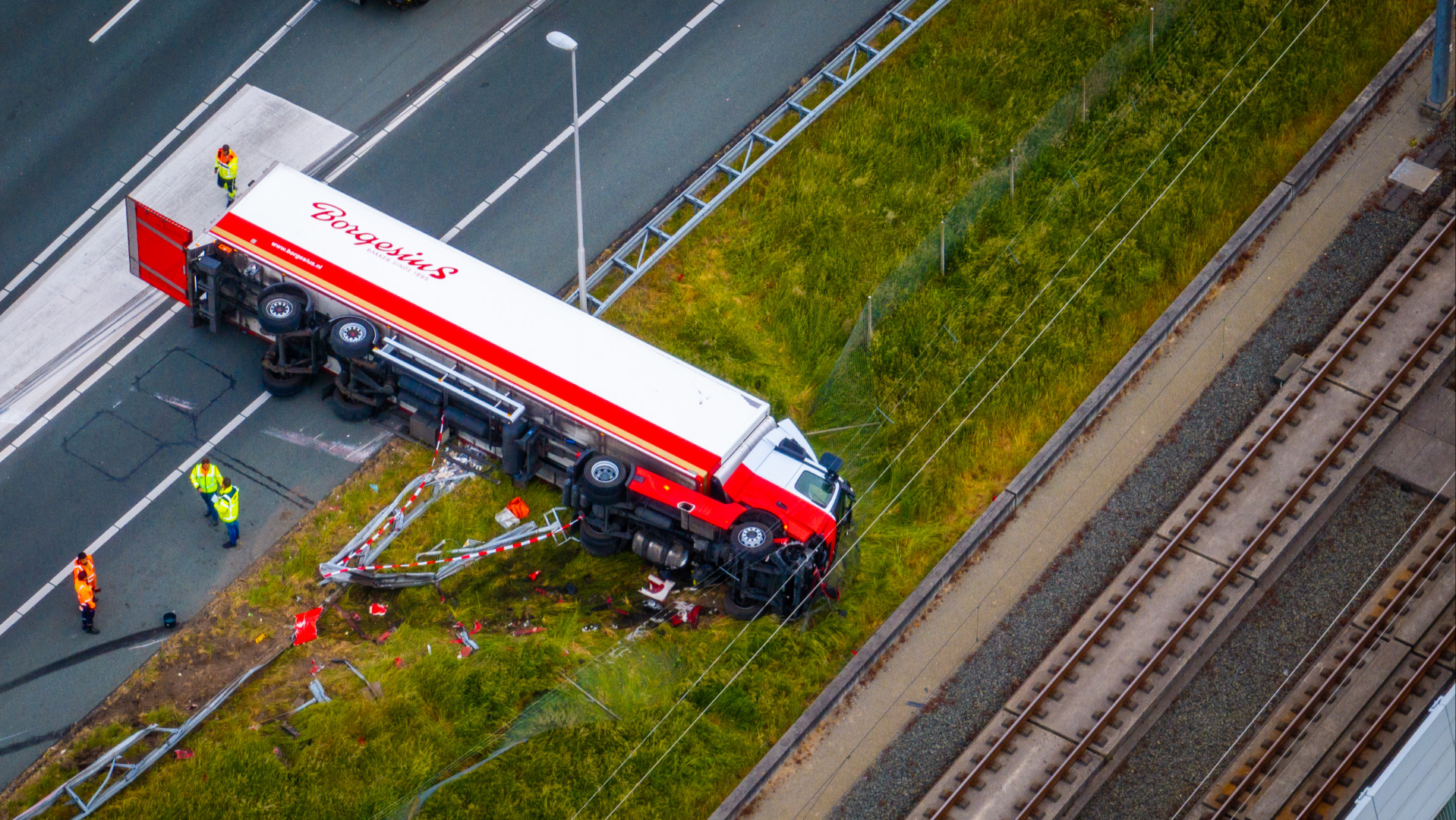 Treinverkeer naar Schiphol lag urenlang deels plat door gekantelde vrachtwagen