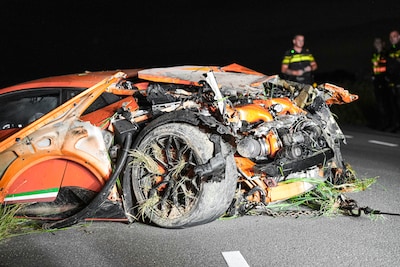 Lamborghini vliegt van dijk en belandt in droge sloot