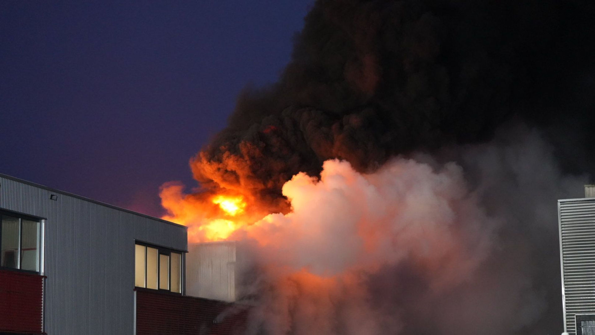 Vlammen slaan uit dak van bedrijfspand