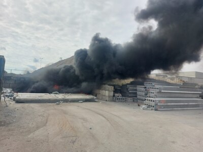 Zwarte rookwolk trekt over bedrijventerrein na brand in isolatiemateriaal
