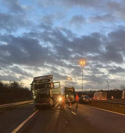 maandag 22 januari 2024, 20:36 uurBREDA - Een vrachtwagen is maandagmiddag gekanteld na een botsing op de A58. Het voertuig reed tegen een andere vrachtwagen. De weg was tijdelijk gesloten tussen het knooppunt Galder en Ulvenhout, maar werd rond 22.00 uur weer vrijgegeven.