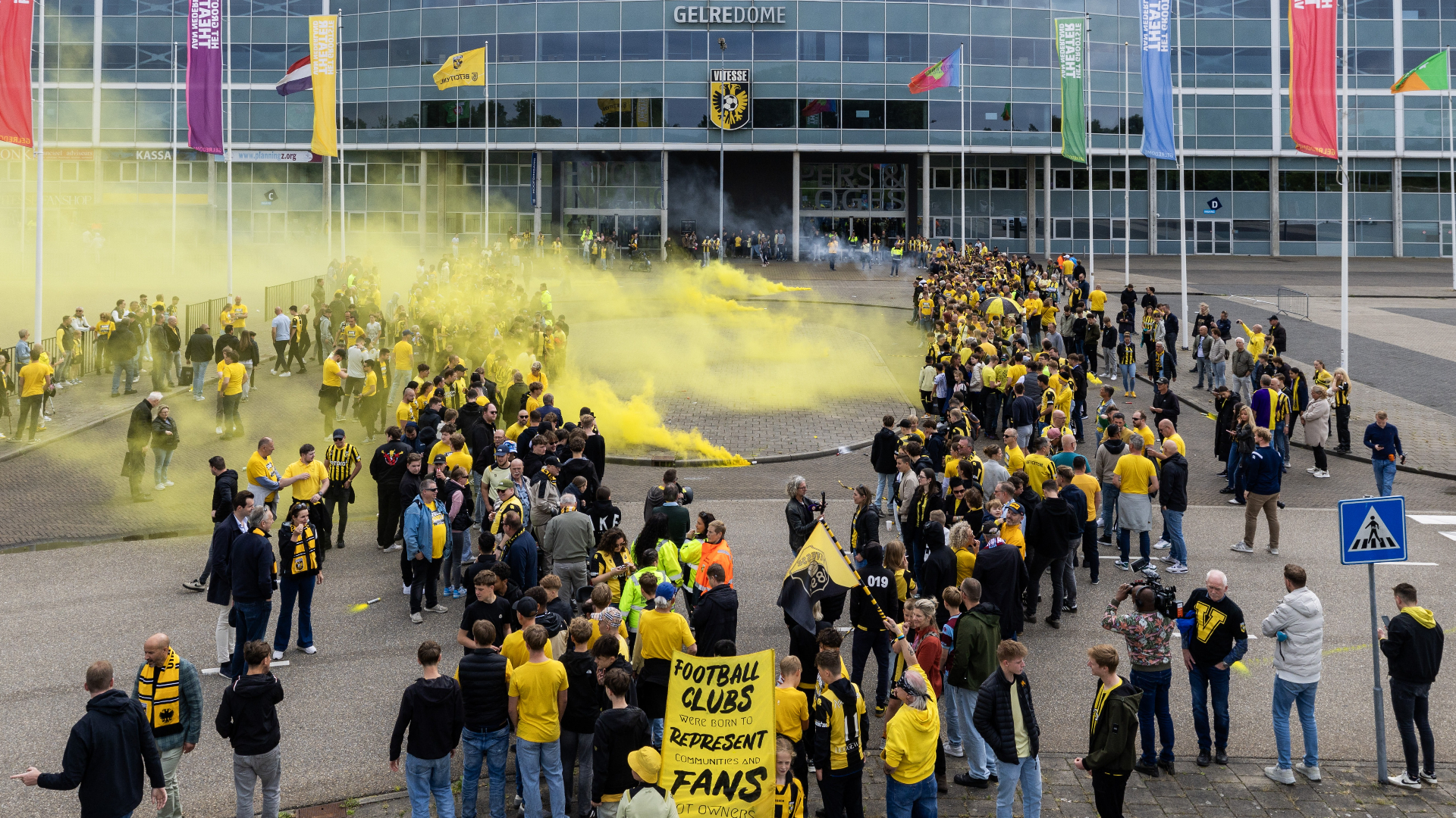 Honderden supporters van Vitesse zijn deze middag afgereisd naar Utrecht. Zojuist is daar in de rechtbank een kort geding begonnen dat hun club tegen de voetbalbond KNVB heeft aangespannen. Vitesse wil de proflicentie terug en komend seizoen in de Keuken Kampioen Divisie uitkomen. De rechter doet morgen uitspraak.