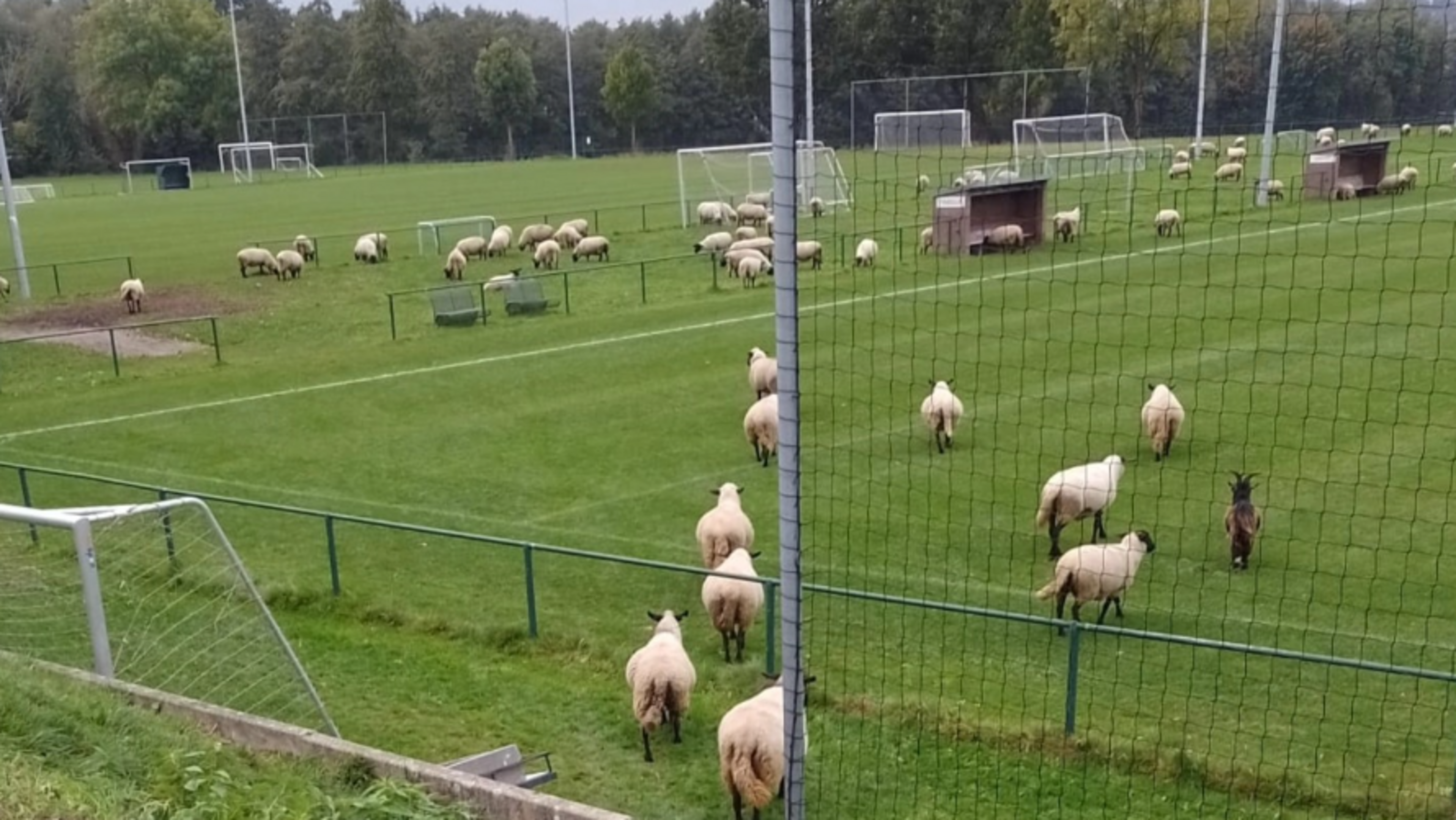 Schapen 'bestormen' voetbalveld en zorgen voor hilariteit
