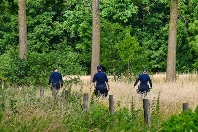 woensdag 25 juni 2025, 12:50 uurAgenten komen met hondenbrokjes uit het bos langs de Kluizerweg die tussen Leende en Valkenswaard richting België loopt. Eén hondje zit al in een politiewagen, maar het tweede beestje is bang en laat zich deze warme woensdagochtend nog niet vangen. Hun baasje Annette ligt tientallen meters verderop in het bos.