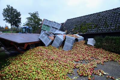 vrijdag 14 oktober 2022, 15:18 uurDe appels werden vervoerd in kratten op een trekker. Het voertuig kantelde nadat de bestuurder een dijk was opgereden.