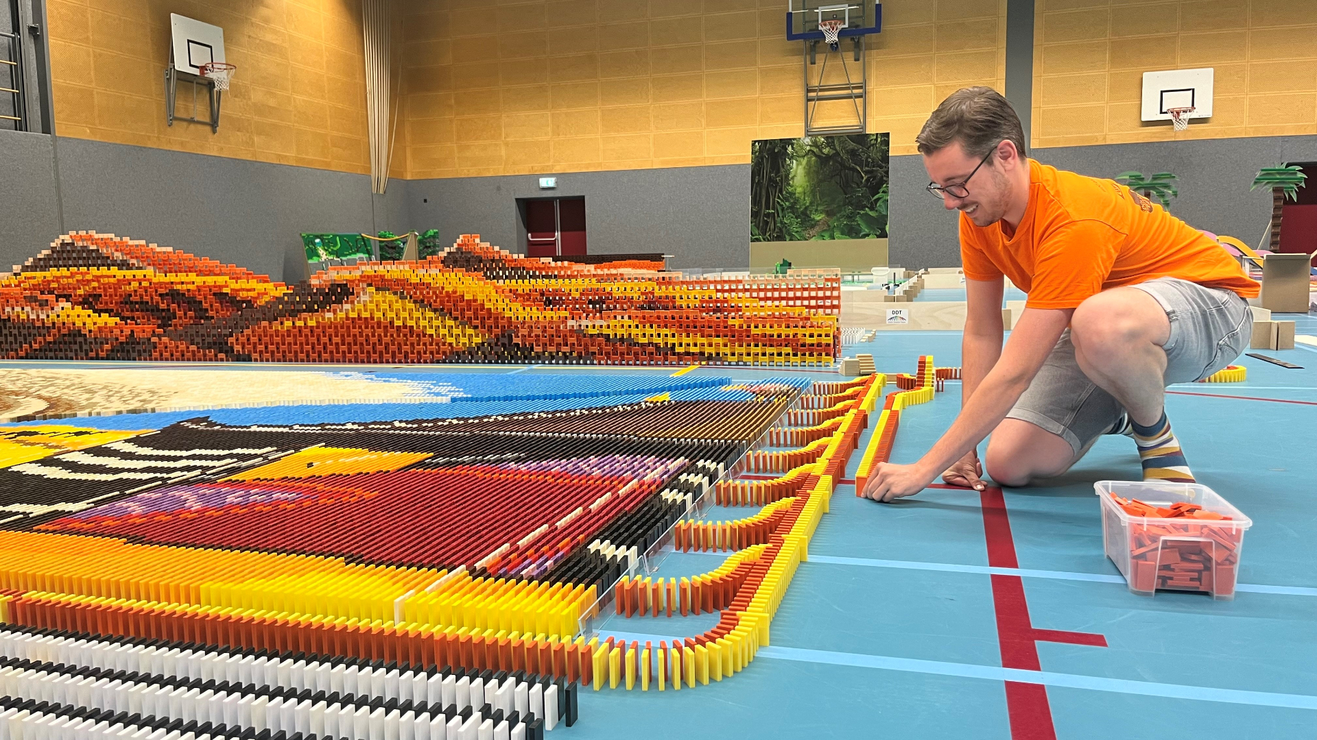 donderdag 22 augustus 2024, 20:01 uurTwee weken zwoegen op je knieën in een warme sporthal voor twintig minuten omvallende dominostenen. Vallen er vrijdag in Veenendaal 900.000 stenen om, dan is er een nieuw wereldamateurrecord. Maar het kan nog misgaan, zegt Pim Vriens van het World Domino Collective (WDC) tegen NU.nl.