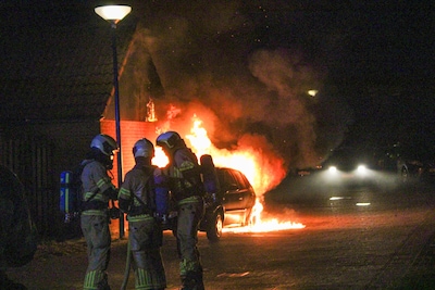 Auto vliegt in brand in Veenendaal, vlammen dreigen over te slaan naar schuur