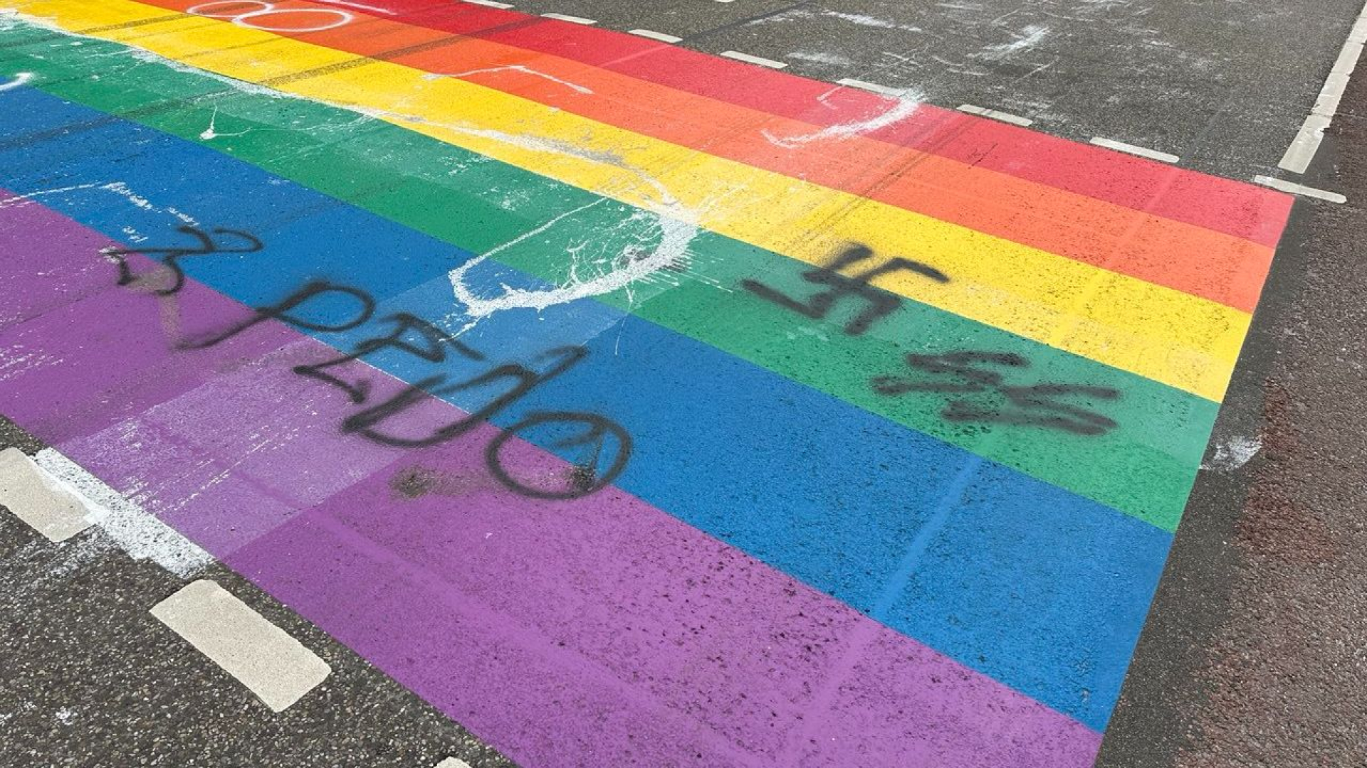 maandag 13 oktober 2025, 16:21 uurAhmed Marcouch reageert op sociale media fel op de bekladding van het regenboogzebrapad in Velp. ‘Hakenkruizen op een regenboogpad, op gevels en zelfs op bomen, dat is geen vandalisme. Dat is een aanval op wie we zijn’, vindt de Arnhemse burgemeester.