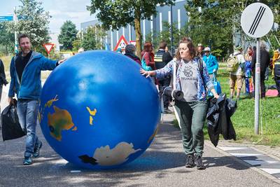 VOLKEL - Na het maandelijkse luchtalarm gingen ze, de vijftig demonstranten, naar de poort van de luchtmachtbasis in Volkel. Onder het oog van een paar marechaussees en een handjevol politieagenten trokken ze van de parkeerplaats naar de toegangspoort. Met rollators, met baby’s in draagzakken, met vredesvlaggen en met een gigantisch wetboek en een rubberen wereldbol.