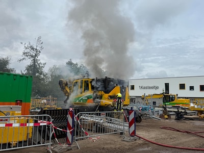 Elektrische graafmachine in brand op bouwplaats
