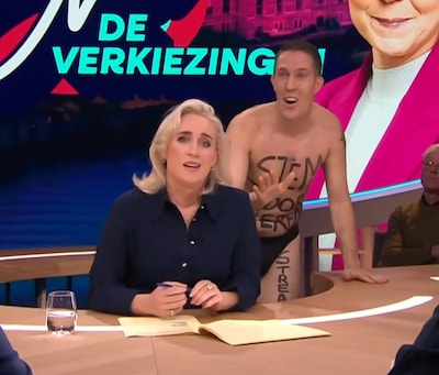 vrijdag 24 oktober 2025, 19:35 uurWie de uitzending van Eva Jinek heeft gemist waarin ‘vegan streaker’ Peter Janssen uit Vught ineens bijna naakt opdook: hou tot aan de verkiezingsdag de televisie in de gaten. Janssen vertelt van plan te zijn nog vaker ergens op te duiken.