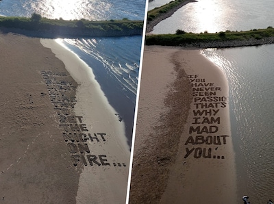 maandag 2 juni 2025, 23:06 uurWie is de zandkunstenaar die keer op keer mysterieuze (song)teksten strak in het zand langs de Waal in Nijmegen aanbrengt? Het houdt veel Nijmegenaren bezig. De maker is toevallig gevonden en heeft een bijzonder verhaal.
