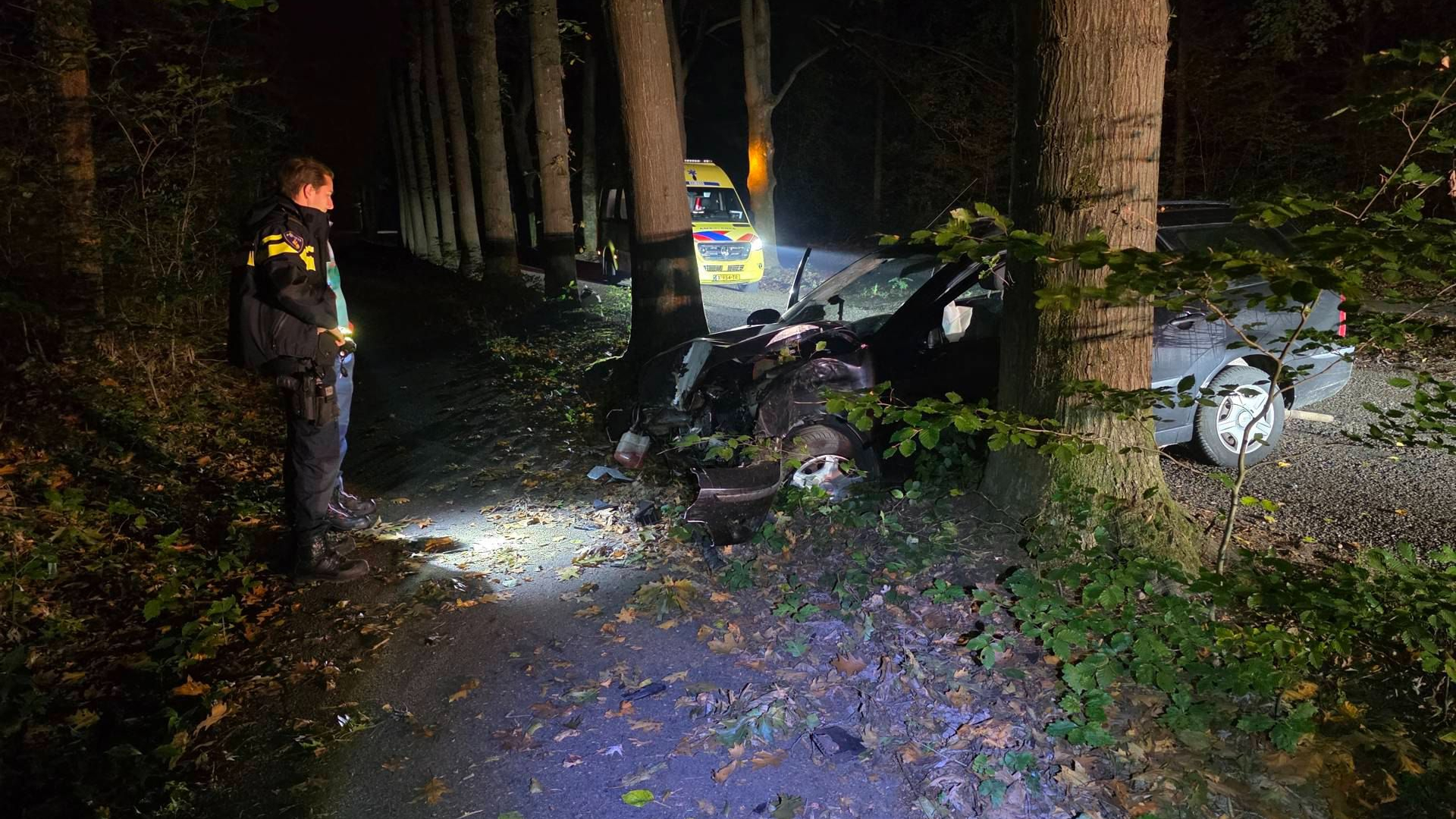 Een auto is in de vroege uren van de woensdagochtend tegen een boom gecrasht langs de Geertjesweg in Wageningen. De auto kwam volledig in de kreukels te liggen door de klap.