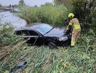 Een auto is zondagavond in het water beland naast de Spieringsluis, aan het eind van de Bandijk in Werkendam. Het ging mis in een flauwe bocht. De hulpdiensten rukten massaal uit.