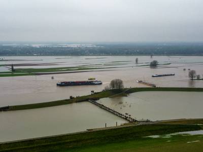 Een schip ligt dwars op de vaargeul in de IJssel bij Westervoort. De scheepvaart in de rivier is gestremd. ,,Er kan geen schip in en uit de IJssel varen", zegt een woordvoerder van Rijkswaterstaat.