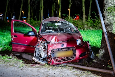 Auto vliegt uit de bocht en ramt lantaarnpaal en boom