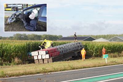 Vrachtwagen ligt in maisveld na zwaar ongeluk, automobilist (19) gewond