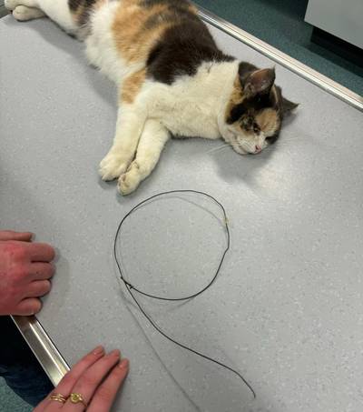 Dat was schrikken woensdagavond voor Juliette Waard uit Yerseke. Haar kat Mosey bleek bij thuiskomst een strop van ijzerdraad om haar middel te hebben. 'Bizar dit'.