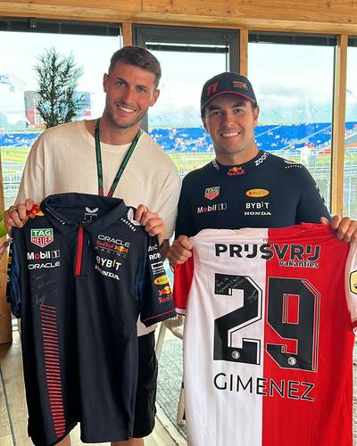 Een ontmoeting tussen twee Mexicaanse sporthelden vandaag in Zandvoort. Feyenoord-spits Santiago Giménez was toeschouwer bij de eerste en tweede vrije training voor de Grand Prix van Nederland en ruilde van shirtjes met Sergio Pérez, de Mexicaanse teamgenoot van Max Verstappen bij Red Bull Racing. Pérez kreeg een shirtje van Feyenoord en van de nationale ploeg van Mexico.