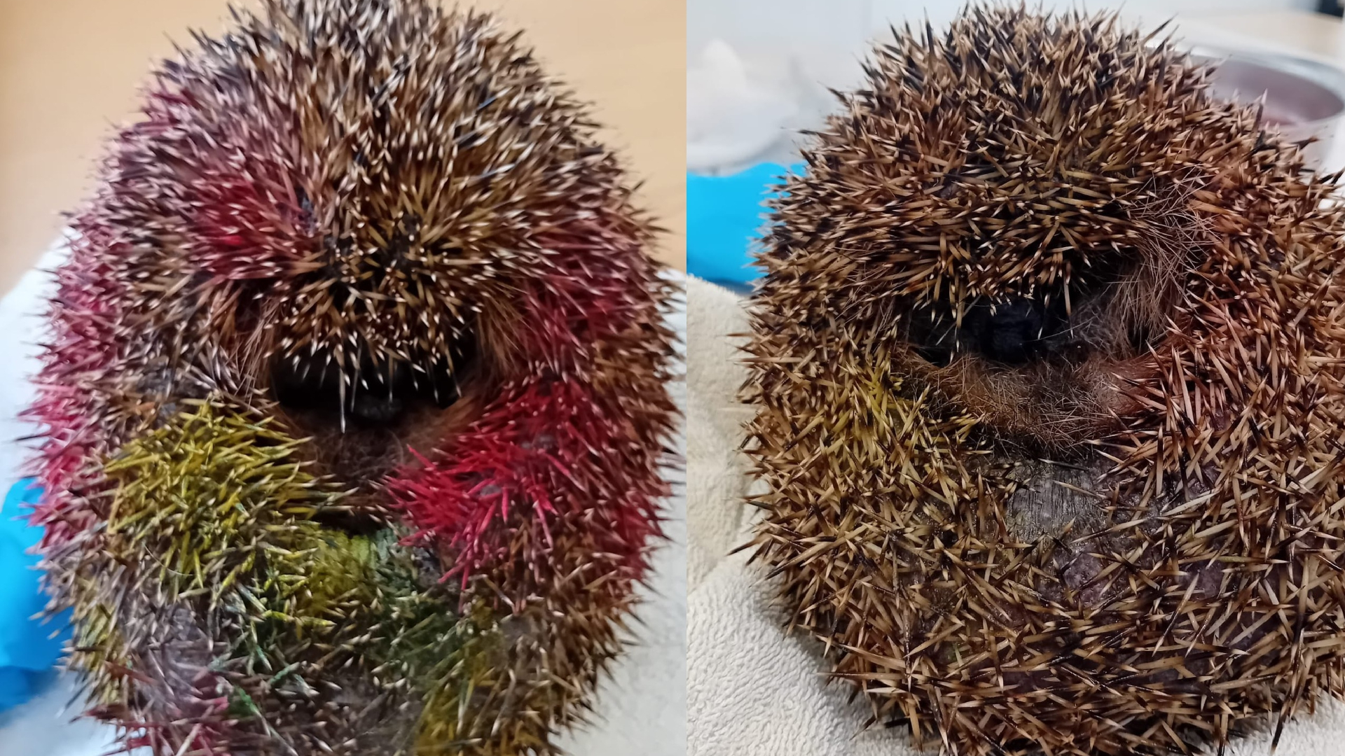 In een tuin in Zeist is woensdagochtend een egel met neon-kleuren op zijn stekels gevonden. Het dier is door de dierenambulance naar Stichting Snorhaar gebracht.