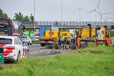 Vrachtwagen verliest lading met 25 loodzware betonblokken op A16: lange file en schade aan wegdek