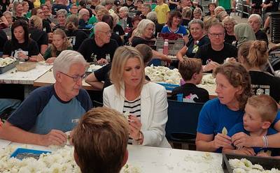 Veel lachende gezichten deze vrijdag in Zundert. Wat wil je, koningin Máxima liet zich zien tijdens de laatste voorbereidingen voor het Corso Zundert, waarvan zondag de traditionele parade plaatsvindt. De koninklijke hoogheid stak ook de armen uit de mouwen: ze pakte een krat met dahlia’s en ging aan de slag met het prikken en tikken van de bloemen.