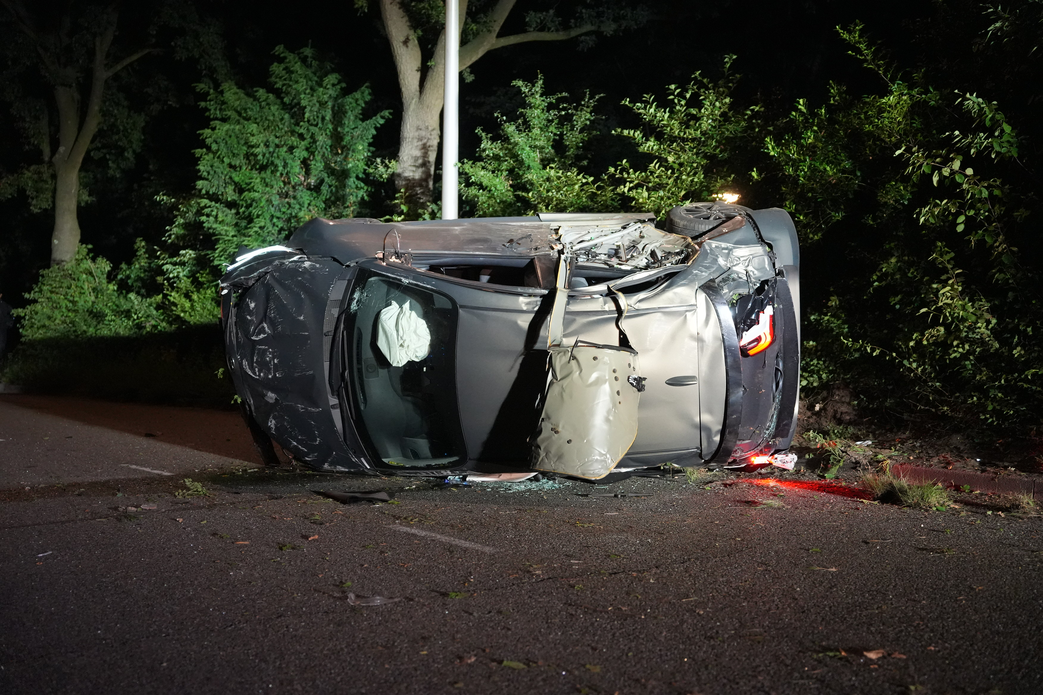 Een flink in elkaar gedeukte auto die op zijn zijkant op de weg ligt, temidden van de brokstukken. Dat duistere tafereel was zondagnacht te zien op de Zwartewaterallee in Zwolle. De bestuurder is aangehouden omdat hij onder invloed bleek van drugs.