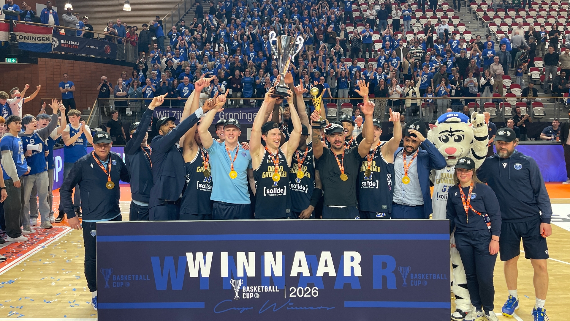 zondag 22 maart 2026, 15:24 uurDonar heeft na een uiterst spannende finale de nationale beker veroverd door in Almere met 78-77 te winnen van Landstede Hammers uit Zwolle. Het is de achtste keer dat de Groningse basketbalclub deze prijs wint.