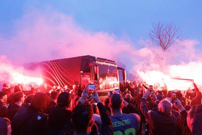 Feyenoord-spelersbus na heroïsche zege door vele supporters onthaald bij Varkenoord