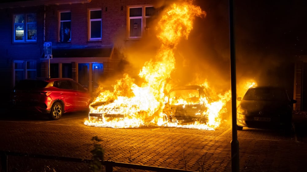 In Amsterdam-Noord is vannacht een woningbrand ontstaan nadat twee auto's in vlammen opgingen. Op beelden is te zien hoe de vlammen van een van de voertuigen overgaan op het huis.