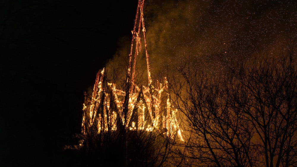 Toren van Vondelkerk in Amsterdam staat volledig in lichterlaaie