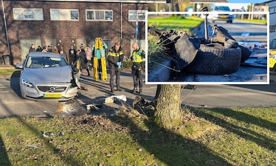 Auto botst tegen boom op drukke weg in Apeldoorn en verliest voorwiel, bestuurder raakt gewond