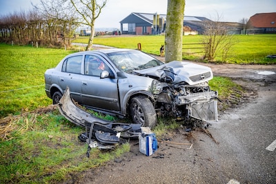Een auto is dinsdagochtend tegen een boom gecrasht op de Dijkgraaf de Leeuwweg in Appeltern. De automobilist verloor de macht over het stuur en belandde in de berm.